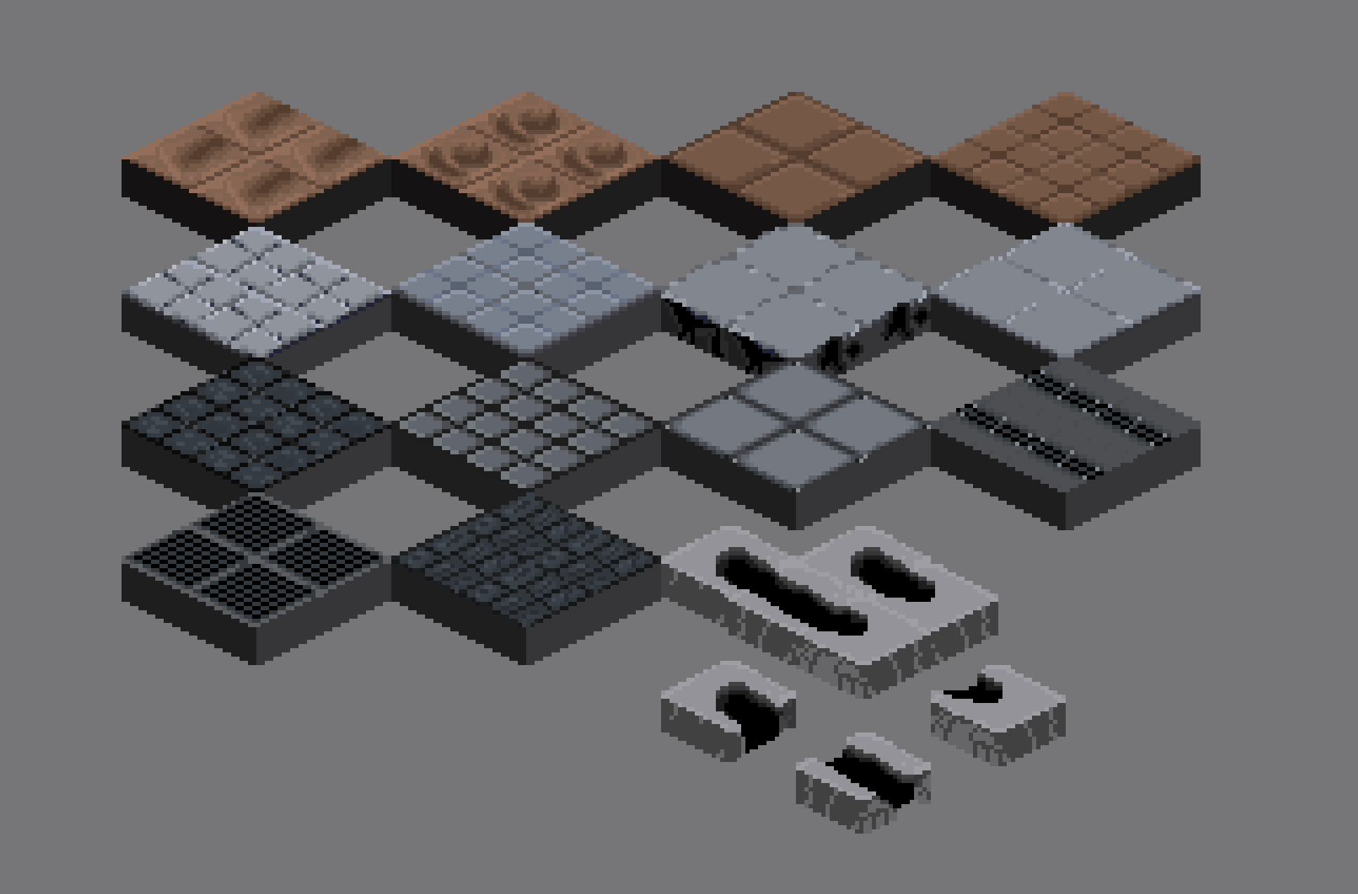 The bottom tiles are a bit of an experiment, 3 tiles make a kind of hole in the ground. Can be flipped horizontally to make a line in the other direction.